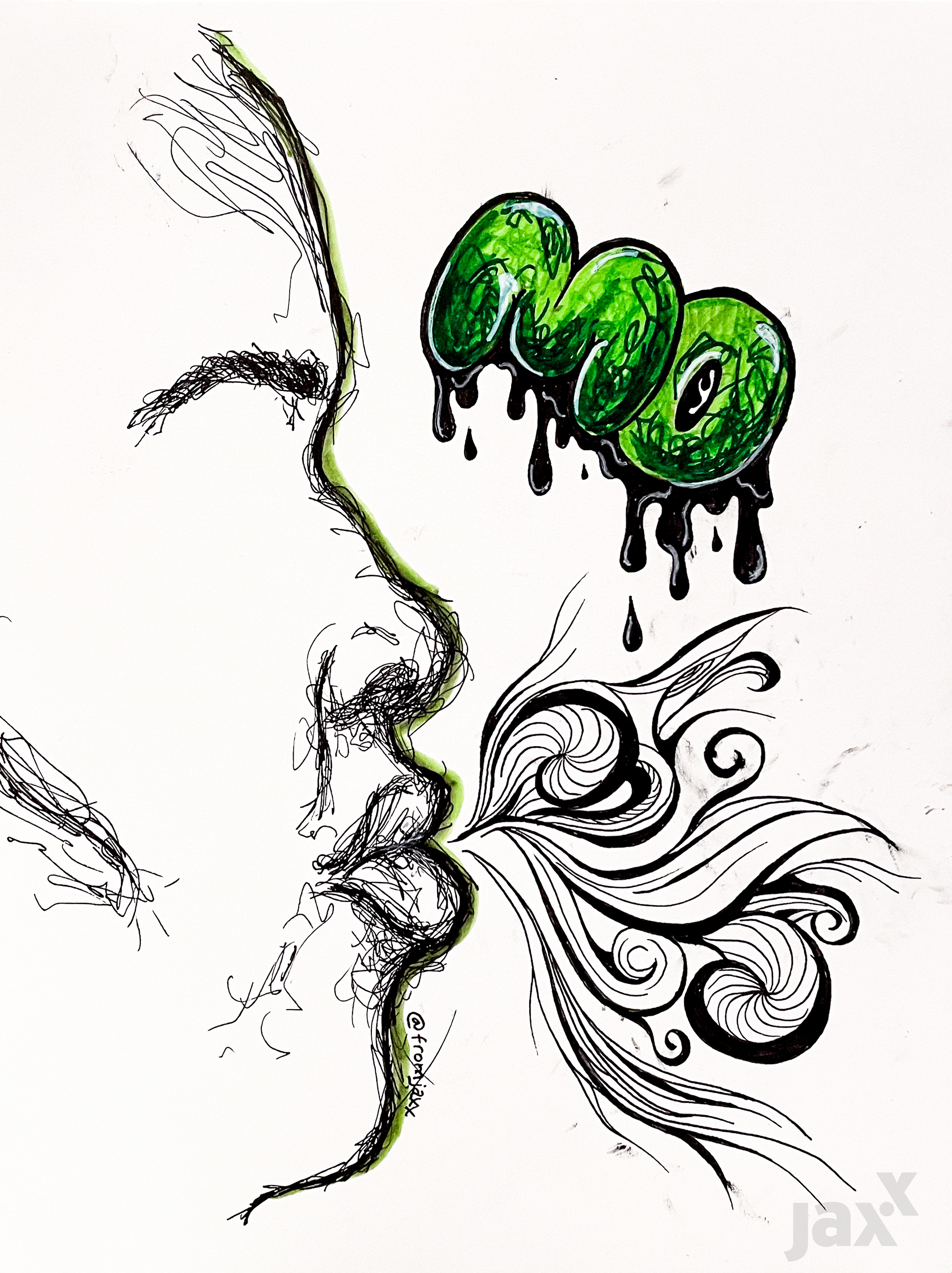 I made this piece on a bad brain day while listening to Pierce the Veil, Korn, Muse, and Metallica. As an autistic person, my affect is often incongruent with my effect, just like this piece. I often feel tethered, while flee-flowing. My brain is often flooded with contradictions.